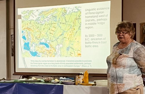 Everyone loves a mystery, but perhaps not more than the Finns as they search for their origins. The Finnish Heritage Museum was pleased to host Dr. Sharon Franklin Rahkonen to our April meeting. Dr. Rahkonen is currently the council chair for the Finnish Council of America of Finlandia National. Sharon Franklin Rahkonen, Ph.D., Professor at the Indiana University of Pennsylvania from 1990-2021 was welcomed by our president, Dave Leifer, and the audience learned about her Fulbright Scholar work studying minority identity in Finland (especially Jewish). Dr. Rahkonen has been specializing in Finnish history as well as Russian history and she wanted to talk to the group about pre-history (before written history). Once a record is written it is the beginning of history. Why are Finns so different? Our language confuses people. There is a big gap in our knowledge of history as we know it - did it begin maybe 6 to 10,500 years ago. That’s definitely a big gap.