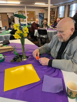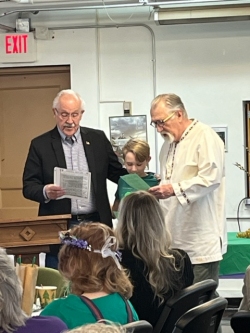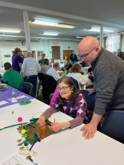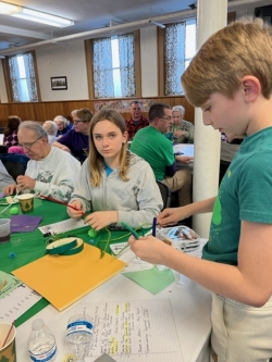 The recitation was wonderful and the laughter was palpable. All the Oinonens, (Wayne, Niles, and William) enjoyed playing their parts. Waynes vaimo was a beautiful Grape Princess. And, of course, the grasshoppers were outta here. But the weather this year has been tough and suddenly we saw a few stray grasshoppers in the fields. What should we do? How can we help our poy? Yes, we will set up an opportunity for everyone to help Saint Urho. On each table there was a bag and in the bag was one or two of these stray grasshoppers. Also there was string and tape and paperclips and other interesting things. Each group at the table got busy designing a way to trap and eradicate these stray grasshoppers. You can see from the pictures that we had lots of good ideas. We will no longer be seeing any grasshoppers in our grape fields here in Fairport Harbor.
